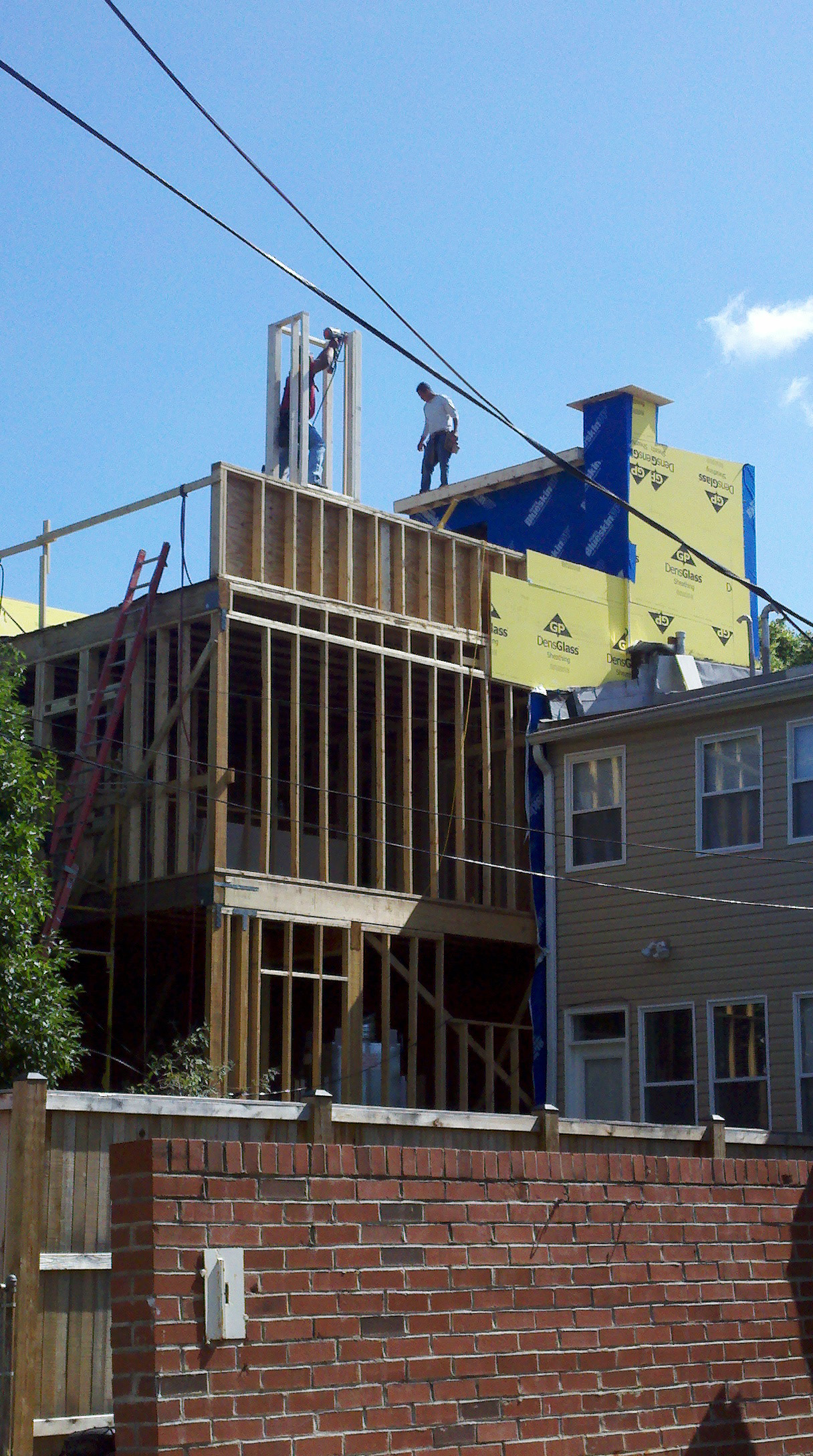 A new basement area was carefully excavated making sure to protect two existing trees cherished by the client after which the three level structure was built above and topped off with a penthouse that provides stair access to the roof.
